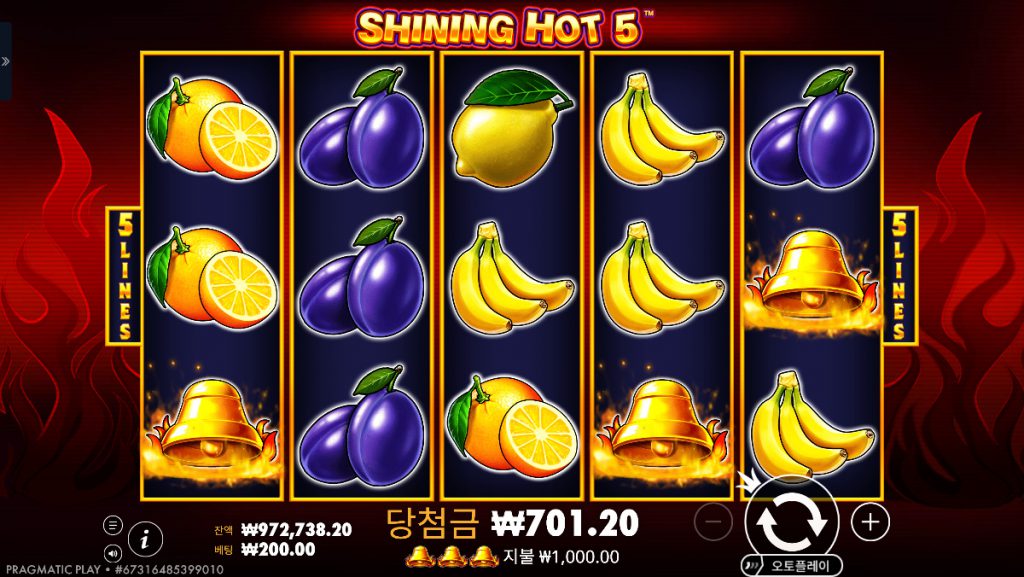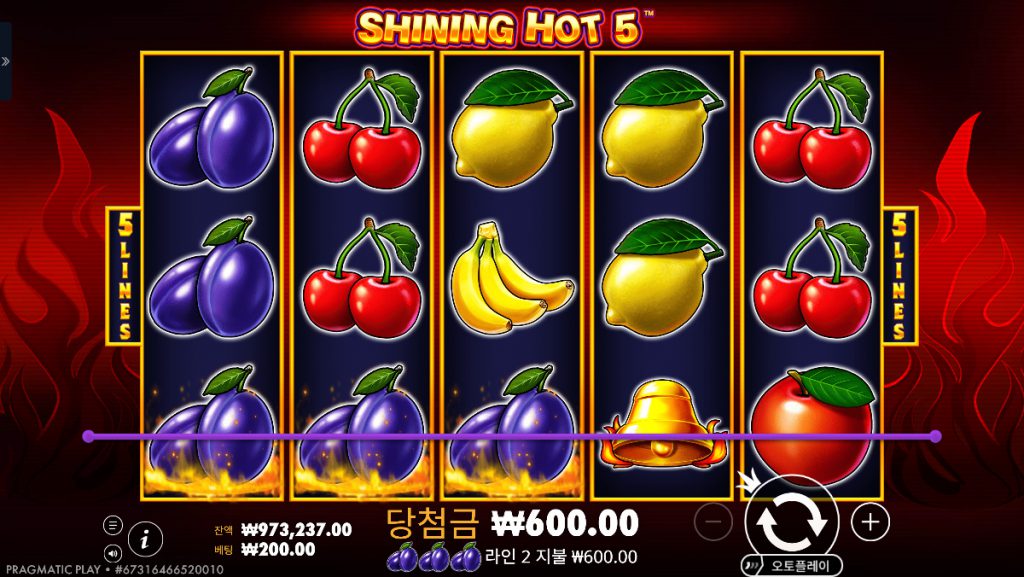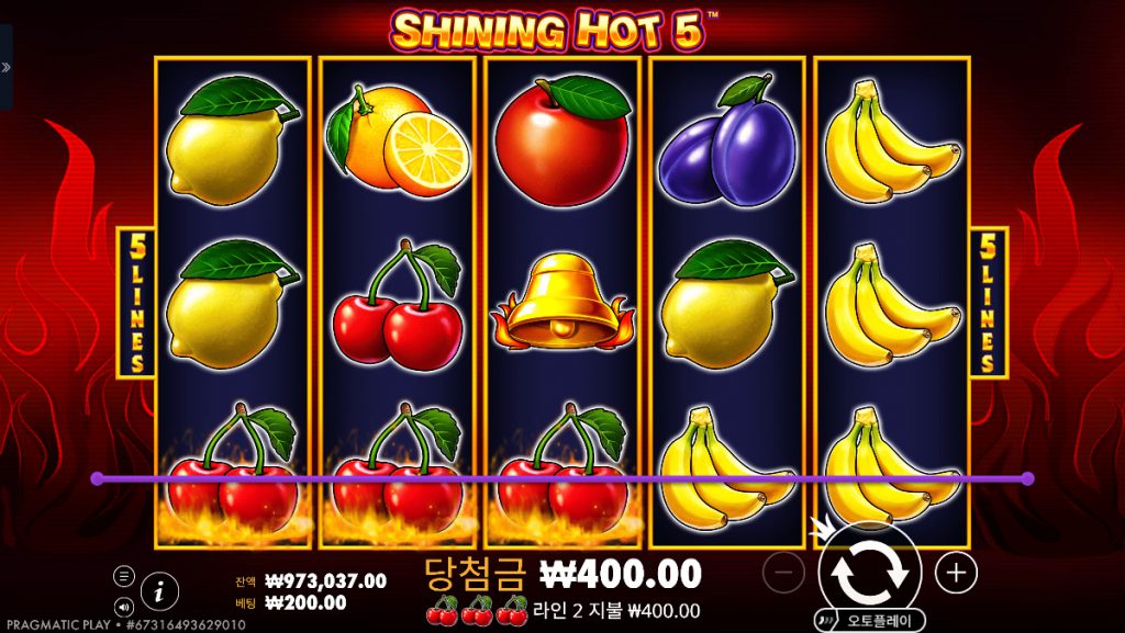 Pragmatic Play의 SHINING HOT 5 는 고전적인 과일 머신의 단순함을 그대로 계승하면서도 세련된 비주얼과 매끄러운 플레이감을 더한 슬롯 게임입니다. 불꽃이 타오르는 듯한 배경에 선명한 과일 심볼이 배치되어 있으며, 심플한 규칙과 빠른 게임 진행 덕분에 누구나 부담 없이 즐길 수 있습니다. 복잡한 기능이나 화려한 보너스가 없는 대신, 정통 슬롯의 매력과 순수한 승부의 짜릿함을 느낄 수 있는 작품입니다. 특히 고정된 5개의 페이라인 구조는 심플하지만, 큰 배당이 터질 때의 짜릿함은 결코 단순하지 않습니다. 전통적인 슬롯의 향수를 찾는 이들에게 제격인 게임이라 할 수 있습니다.